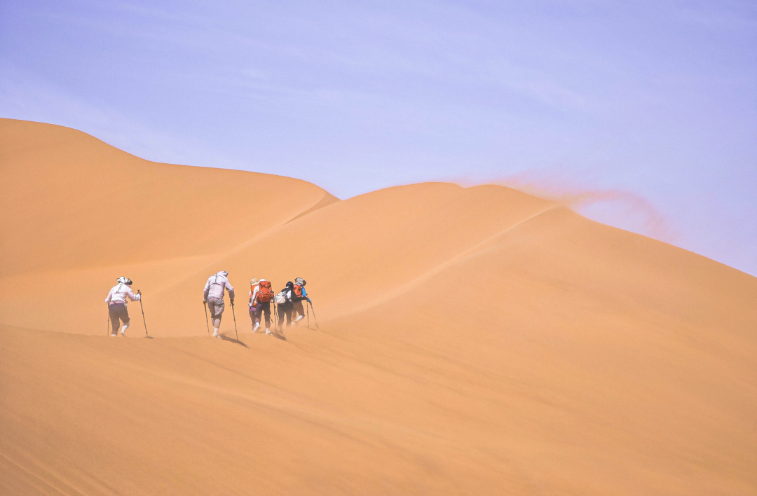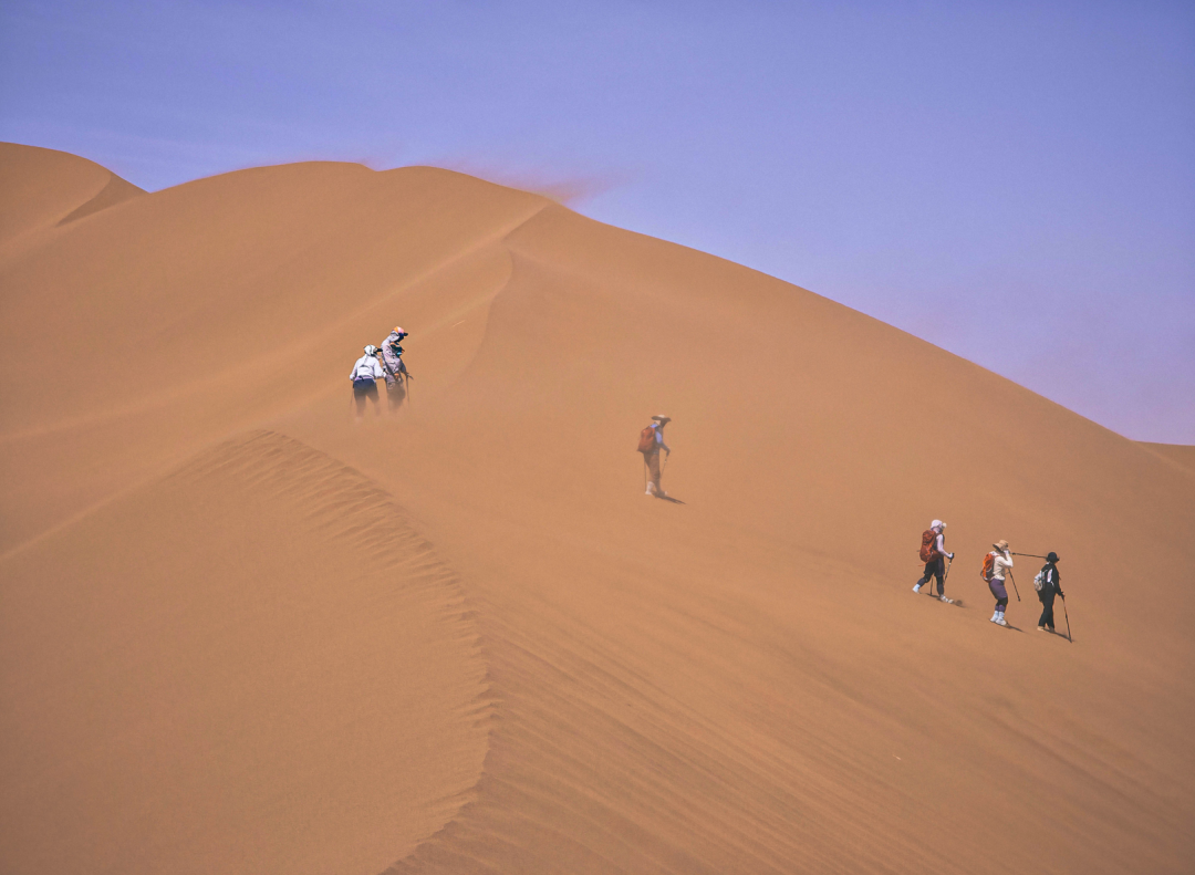 徒步到第三天的时间,最初的规矩早已被风沙吹散,原本整齐的队伍,活像一群被放归沙漠的野生动物,每个人都找到了自己最舒适的"野生状态"。