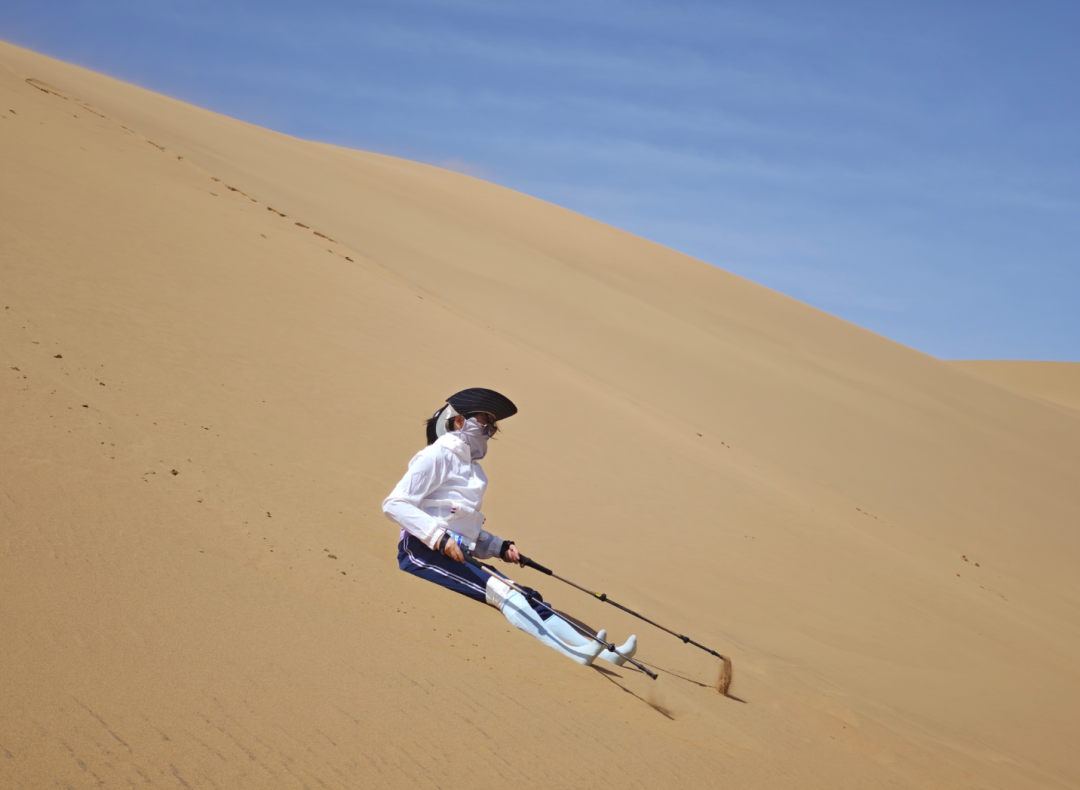 沙漠屁降梭梭板式,遇到陡坡就直接坐下,靠着重力加速度一路滑下去,身后扬起长长的沙浪。