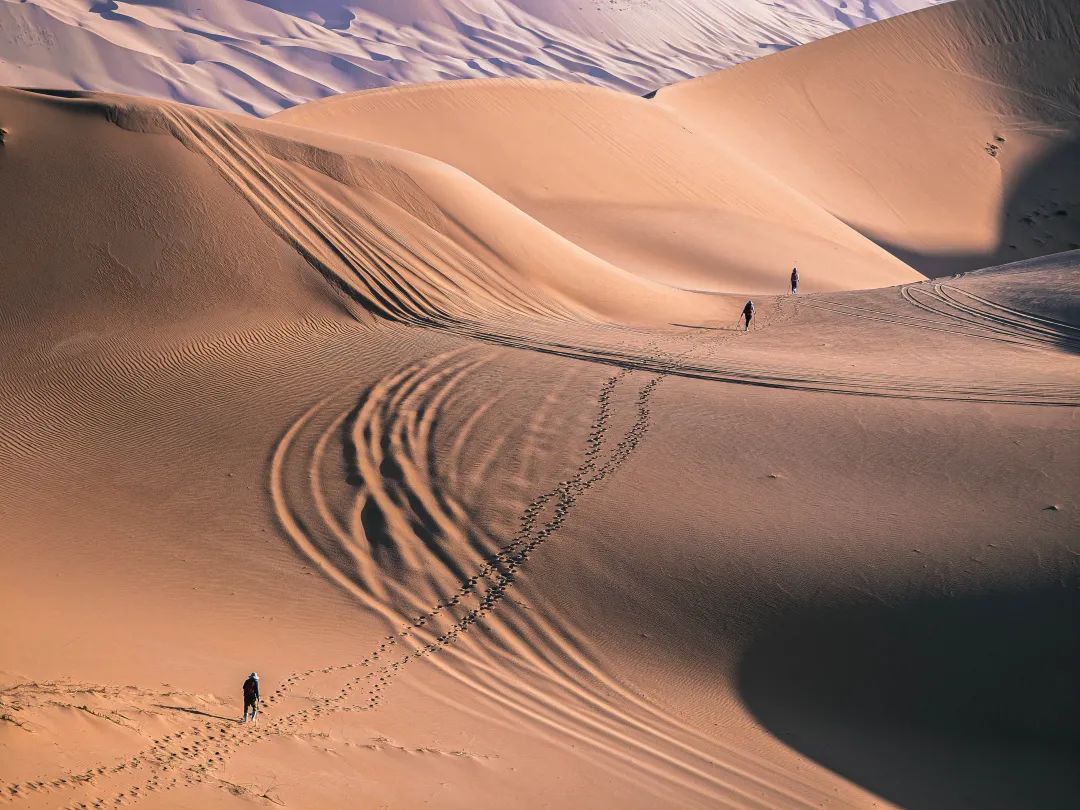 沙漠里一望不到边,眼前的沙丘后依旧是无数个大大小小的沙山,走在这里找不到方向,不知道往哪边走才是营地,这里一定要跟在当地领队后面老老实实走哦。