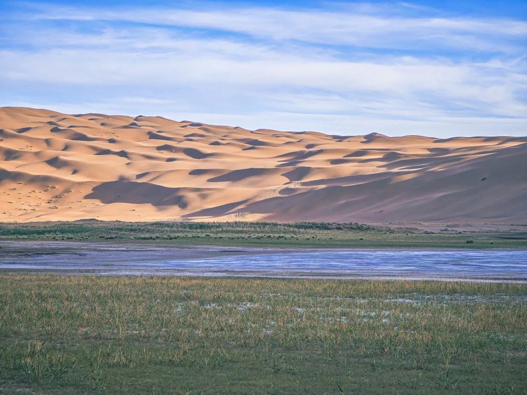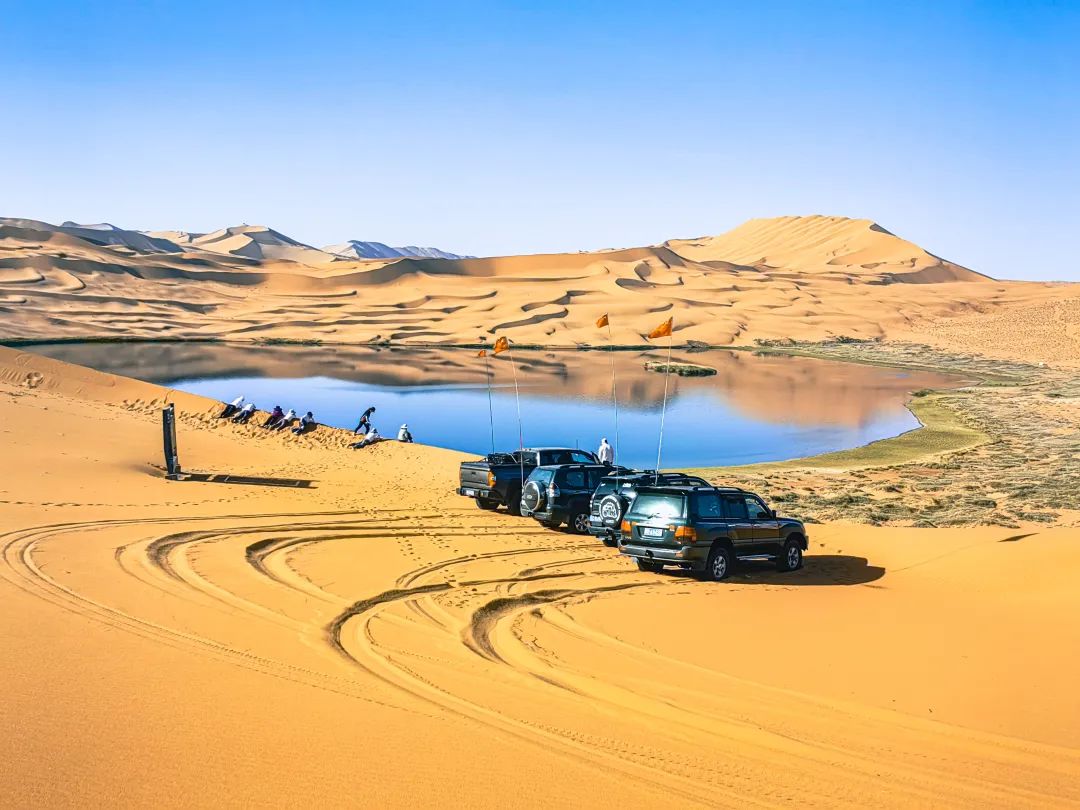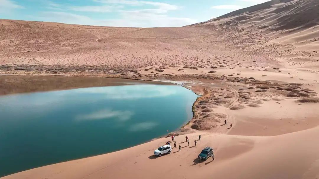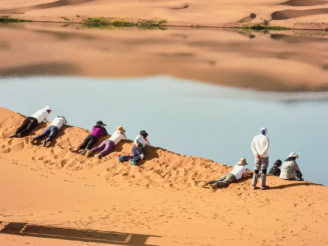 出发不久半小时到达巴丹湖,这是巴丹吉林沙漠的144个海子中,最容易抵达的一个。湖水由地下泉眼补给,终年不枯,即使在最干旱的季节仍保持湛蓝,它像一枚蓝宝石镶嵌在金色沙海中,是我们初探沙漠者的完美起点。