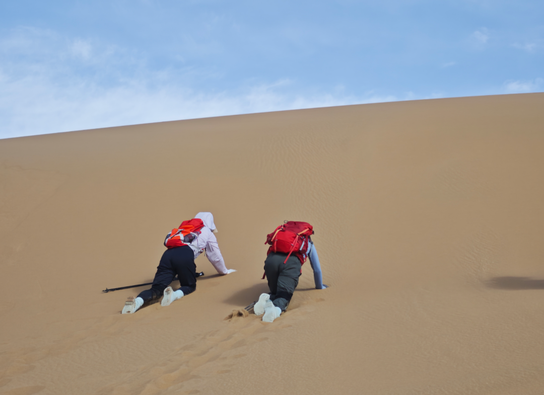 最后20米近乎垂直,非常的陡峭,一脚下去小腿直接陷进沙里,每一步都需要花很大的力气,并且走三步滑回两步,总感觉自己在原地踏步,除了登山杖还可以用膝盖碾进沙里借力。