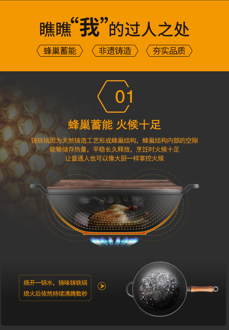 敦厚的锅体,有许多小孔,方便它在受热时将热量积蓄下来,提供更稳定,更好的火候。这是铸味锅具的烹饪奥秘----蜂巢蓄能。