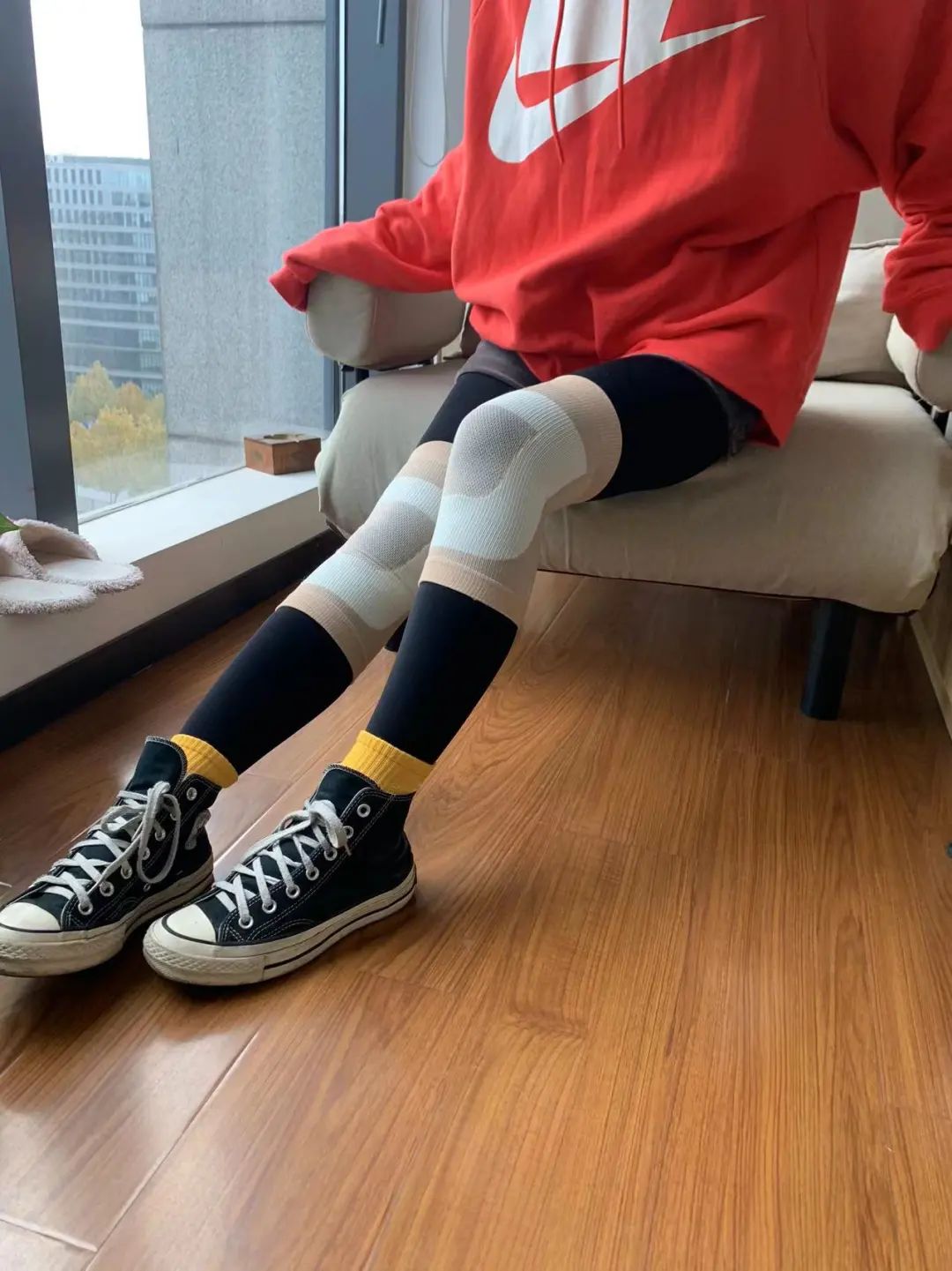 即使在护膝外面再套身紧身打底裤,也是看不出丝毫痕迹还很显瘦。