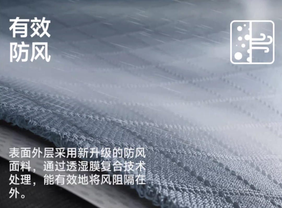 素湃星壳抗寒服表面外层用的是新升级的防风面料,透湿膜复合技术处理,防风等级≤0.3mm/s