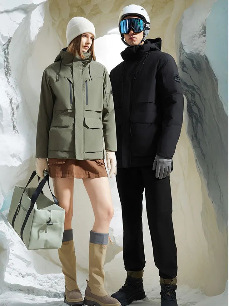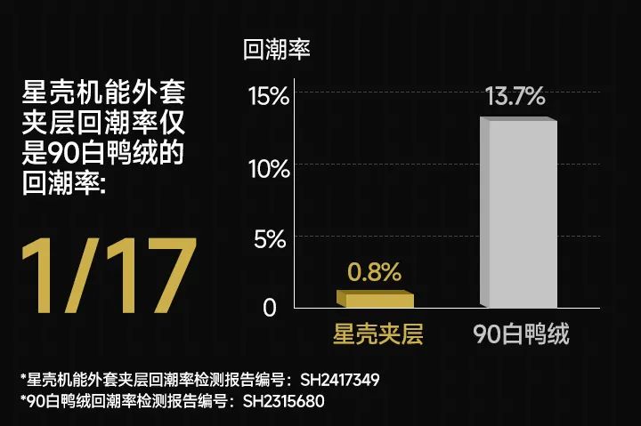 星壳外套夹层回潮率是90白鸭绒1/17,在阴天潮湿环境下更加抗湿冷