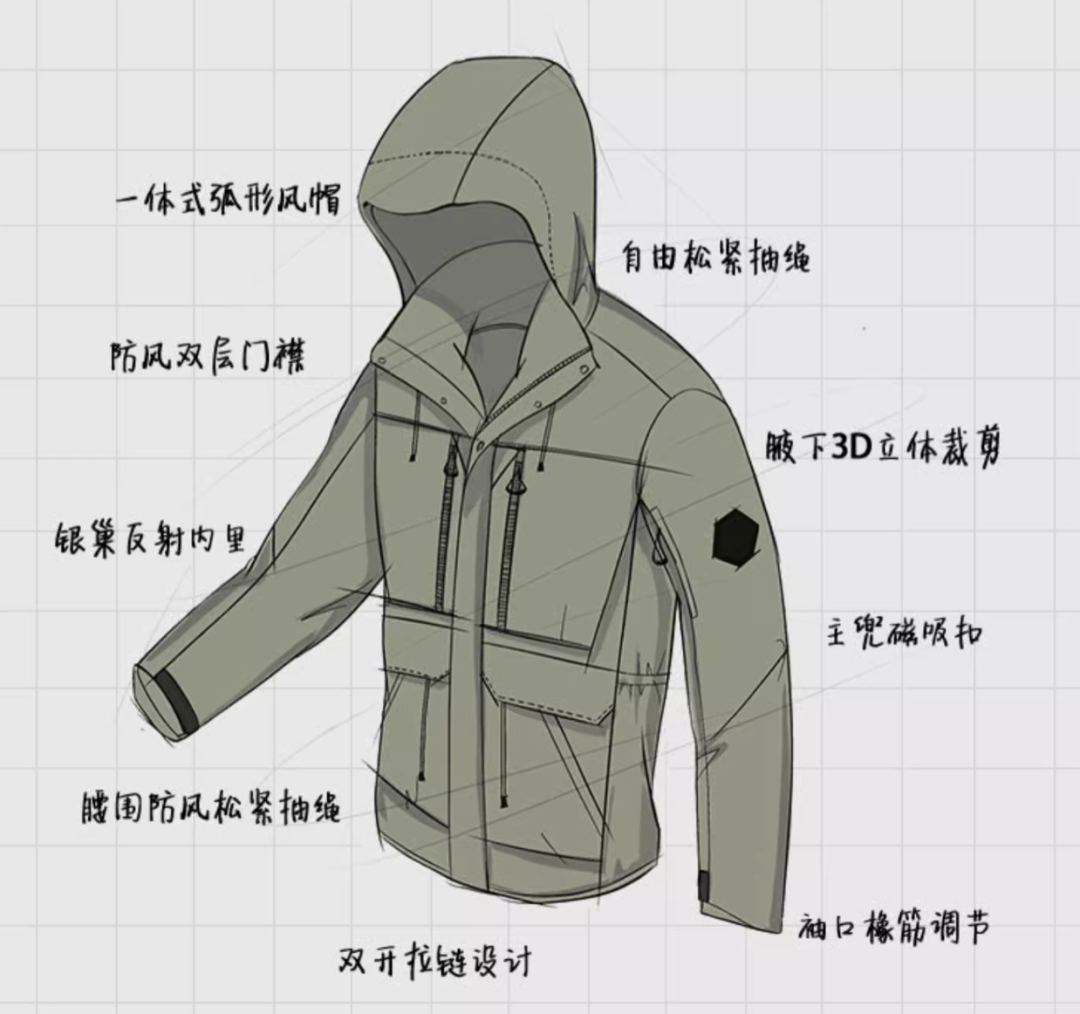 多角度有效防风,帽口处不灌风、袖口冷风灌不进来、下摆拉绳收紧防风