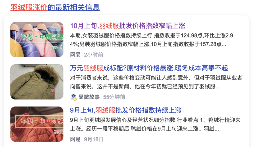 而「羽绒“飞上天”,一件羽绒服成本上涨100元」,这个消息一出,今年的羽绒服销售价格势必要大几百的往上涨
