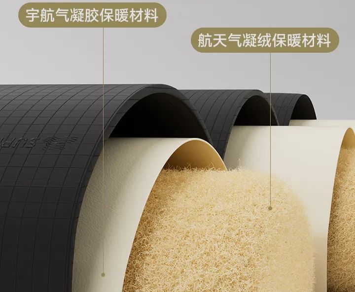 素湃星壳抗寒服使用的是宇航气凝胶保暖材料+航天气凝绒保暖材料填充