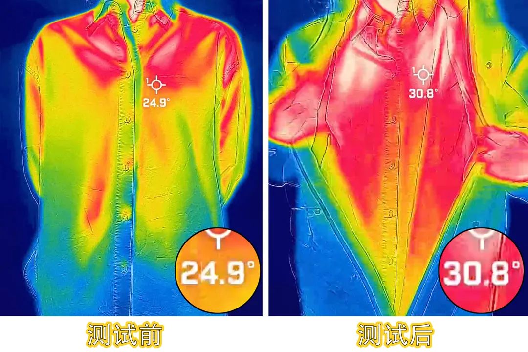 穿上素湃星壳抗寒服之后,10分钟之内升温了近6°C,我一个体寒的人都呼呼浑身冒热汗