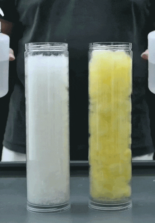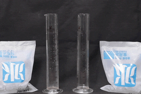 分别在两个桶里同时倒入一定量的水,让水浸湿它们,观察两边“绒”的变化~