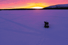 北极风雪非常大!雪地摩托车作为主要交通工具,在北极的寒风中时速40KM/H以上驰骋于冰面,也是北极行中很痛苦的极寒过程。