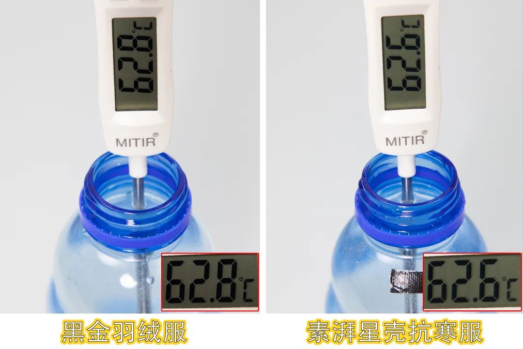 黑金羽绒服和某抗寒服分别包裹两瓶62°C的瓶装热水,放在-25摄氏度°C冰箱