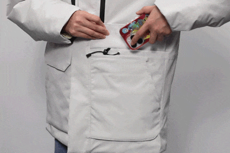 内置一个拉链口袋,要是在户外的极端天气下,防止手机冻没电,可以放进去保暖