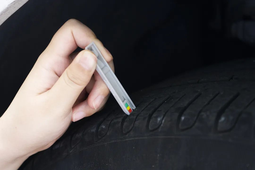 拔下的刀片保护壳还可以检测轮胎磨损程度,将保护壳插入轮胎缝隙中,看纹理最高点到达的颜色即可,绿色最安全,红色则说明磨损程度严重。