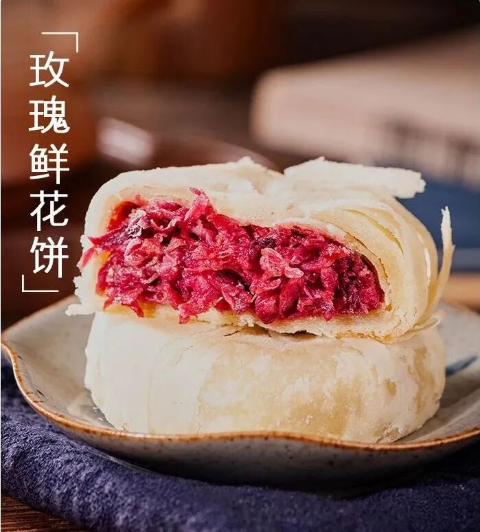 玫瑰鲜花饼👉🏻选用弥渡基地的“墨红玫瑰”,咬一口满满都是玫瑰,花香四溢。