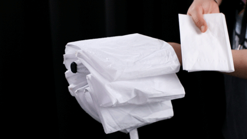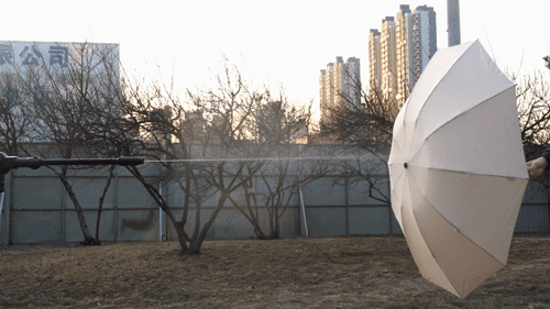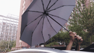 这只骨骼清奇的伞,收伞的过程中,会将接触雨水的一面连着雨水一起牢牢裹住。
