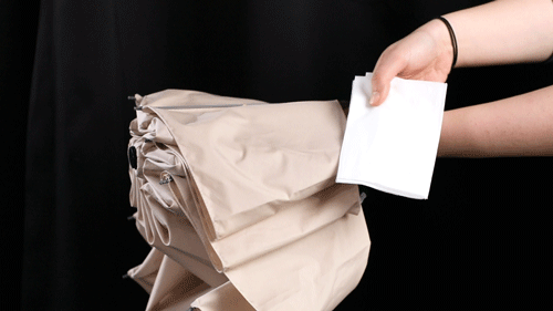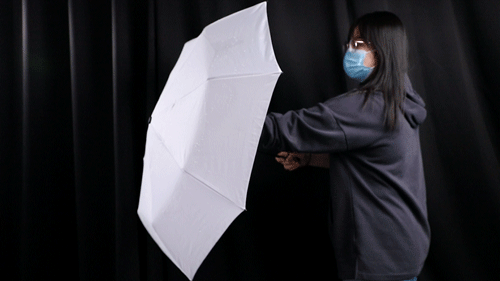 1键反向收起,牢牢包裹雨水。收伞不产生水花,表面更是不留1滴水,可以直接放在桌上,不湿衣服、不湿包。