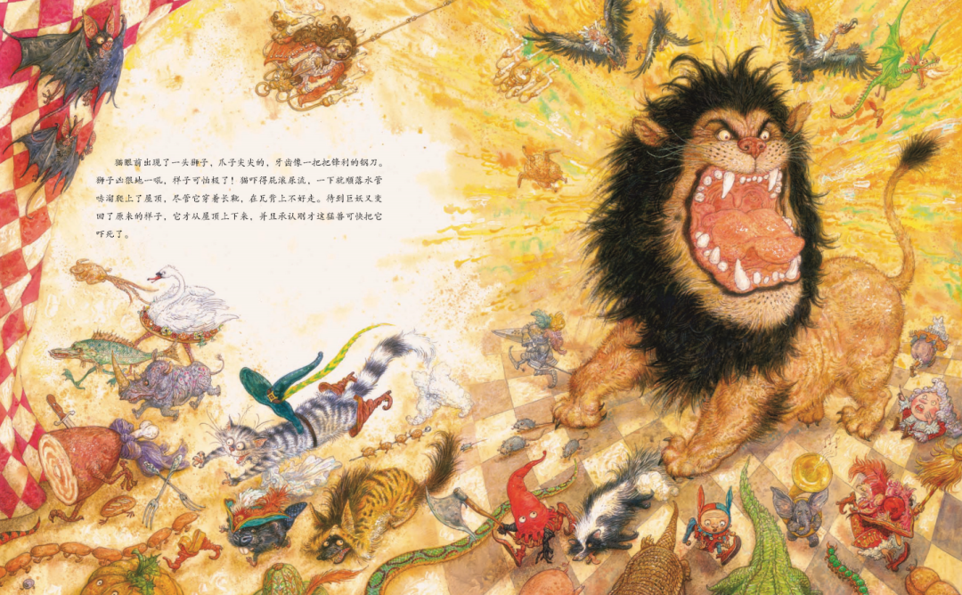 《穿靴子的猫》用带有漫画的手法去创作,颜色丰富、夸张,很像印象派的风格,让人惊叹于他的想象力。