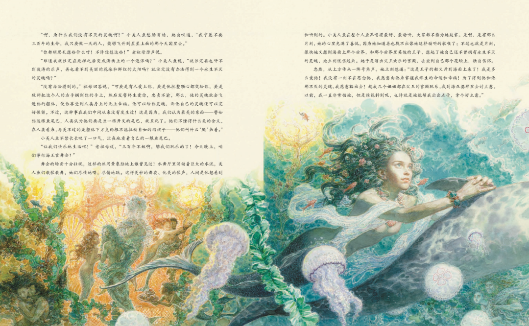 比如《海的女儿》整本书用大场景与特写相配合,用油画的笔法去画,造型写实,色调安静、古典。
