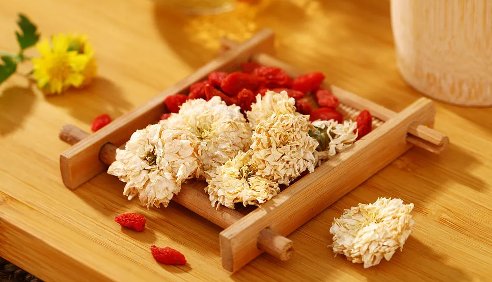 3. 菊花是我们日常中最常喝的一款茶,菊花一般味偏凉,可以平肝明目润肠清热解火。日常还可以加入枸杞,能改善咽喉肿痛同时保护视力明目的功效。