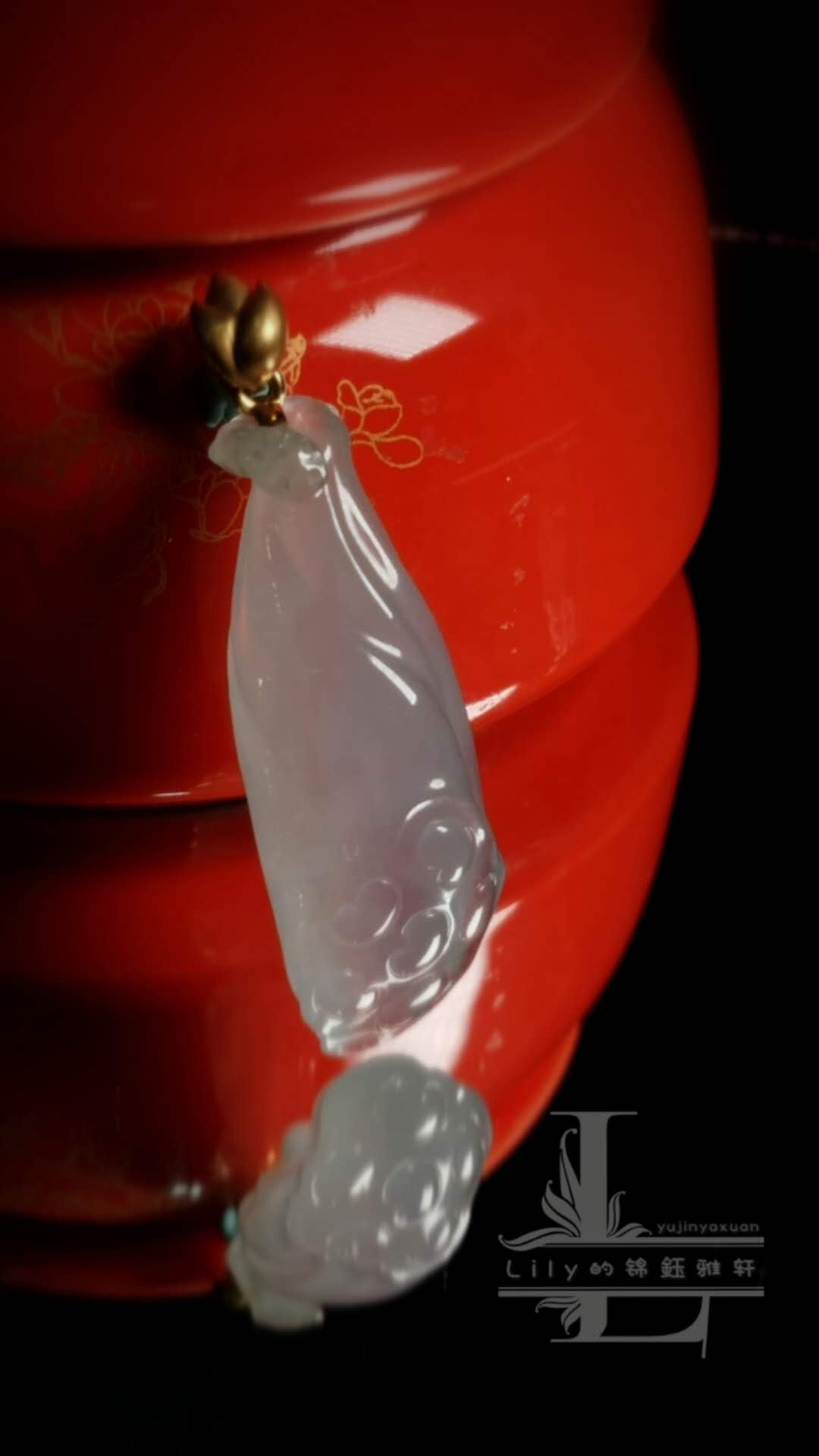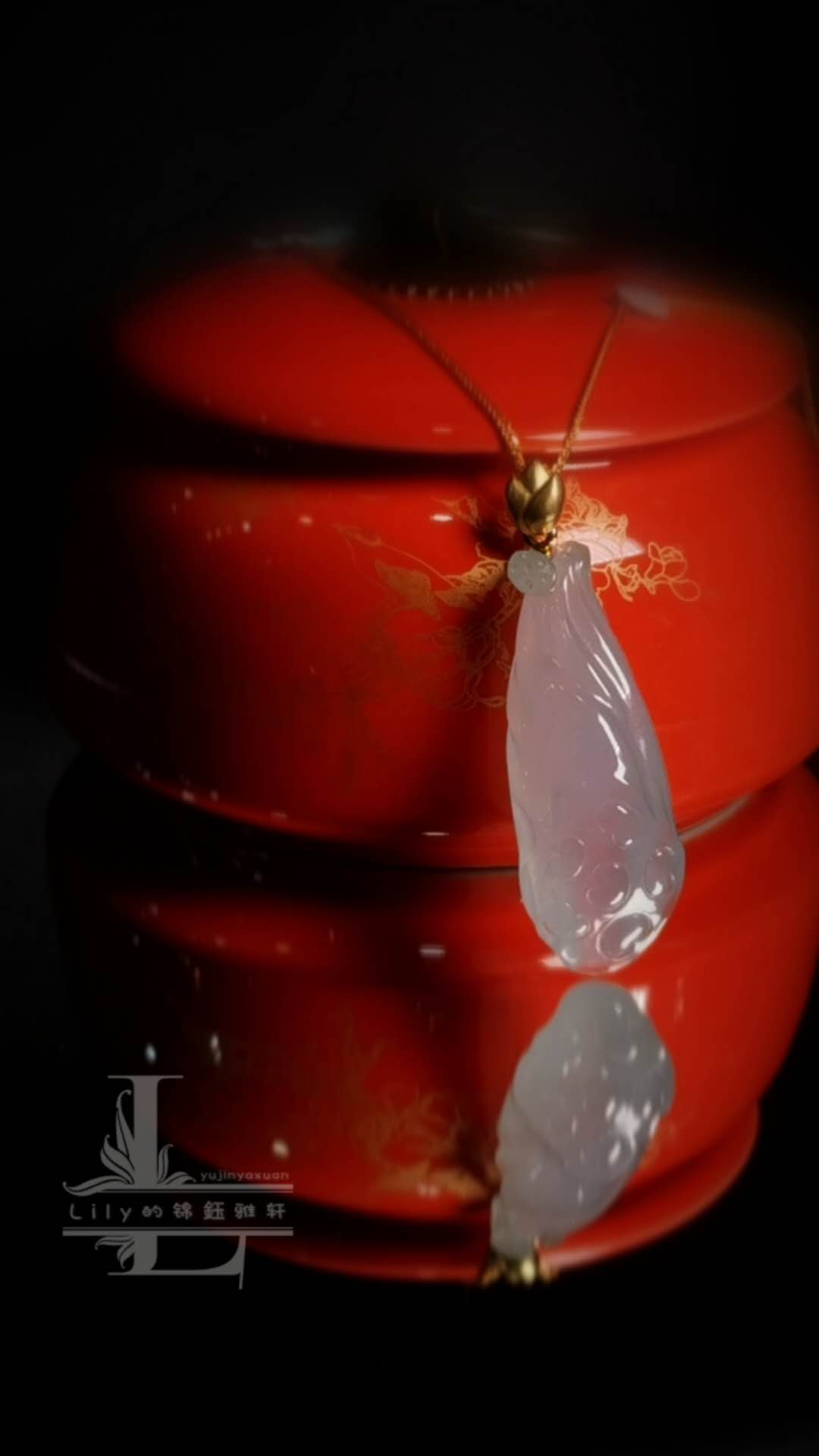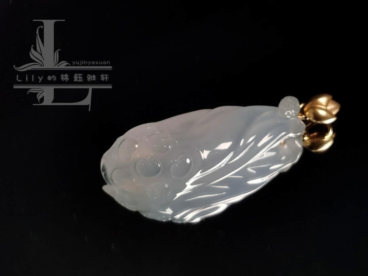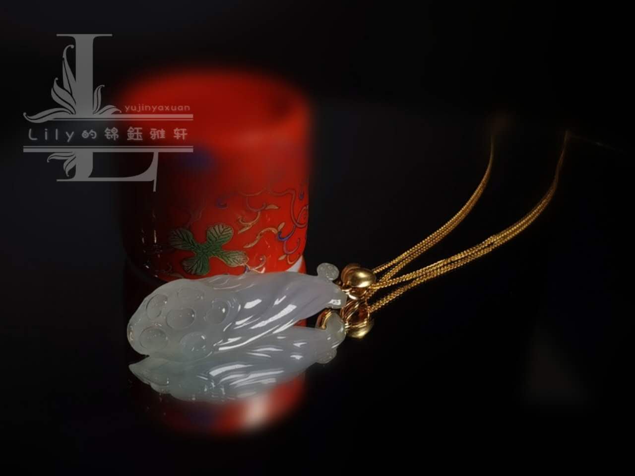 这是一件藕造型的挂件,冰种结构,细腻通透,纯纯厚厚的材料,雕工上是随型就料,细心匠人特意把藕孔处雕刻成心形,这可不只是为图好看,是因“藕与偶”谐音,国人们赋予了藕丰富的想象及内涵。