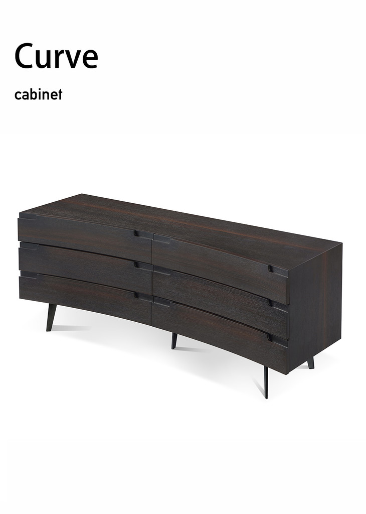 Curve边柜第一眼就会被她独具艺术感的弧形柜身所吸引,由此延伸出优雅大气的韵味。饰面是质朴自然的烟熏木色,纹理深浅变幻充满质感。深色金属脚平衡稳固,细节上的拉手贴心方便取物,又提升装饰性,6个大抽屉保证充足的储物空间,颜值与实用并存。