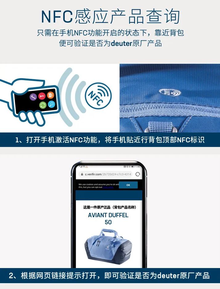 多特大福Duffel系列所有型号——Duffel 35L/50L/70L、Duffel Pro 40L,都有一个小的内置芯片隐藏在缝在NFC标志下。NFC技术最常应用于手机,在旅行包上使用并不多见。它具有「定位+验真」的功能,可以被大多数普通的智能手机扫描。