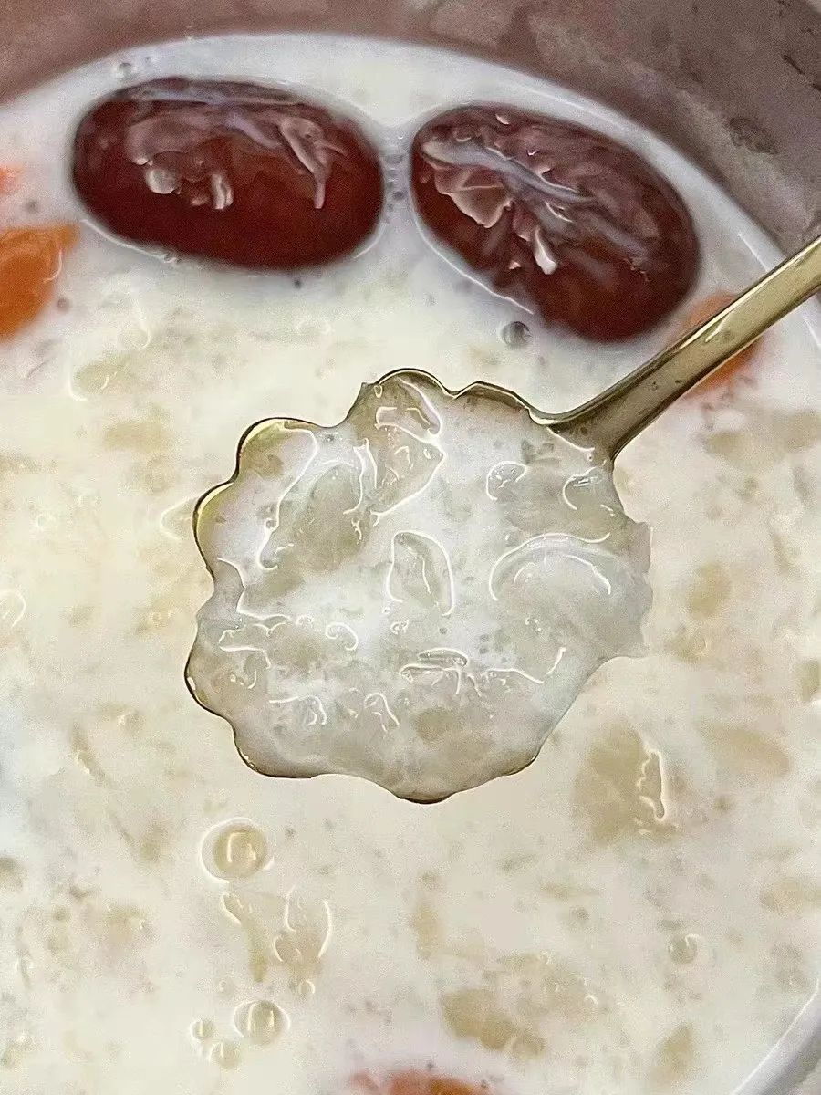 在银耳羹里面加上红枣和牛奶,又好喝又有营养,光看着就食欲大增。