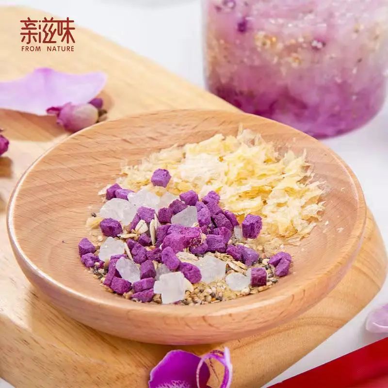 含有紫薯干、藜麦、小麦胚芽、燕麦片、奇亚籽等粗粮的银耳伴侣,