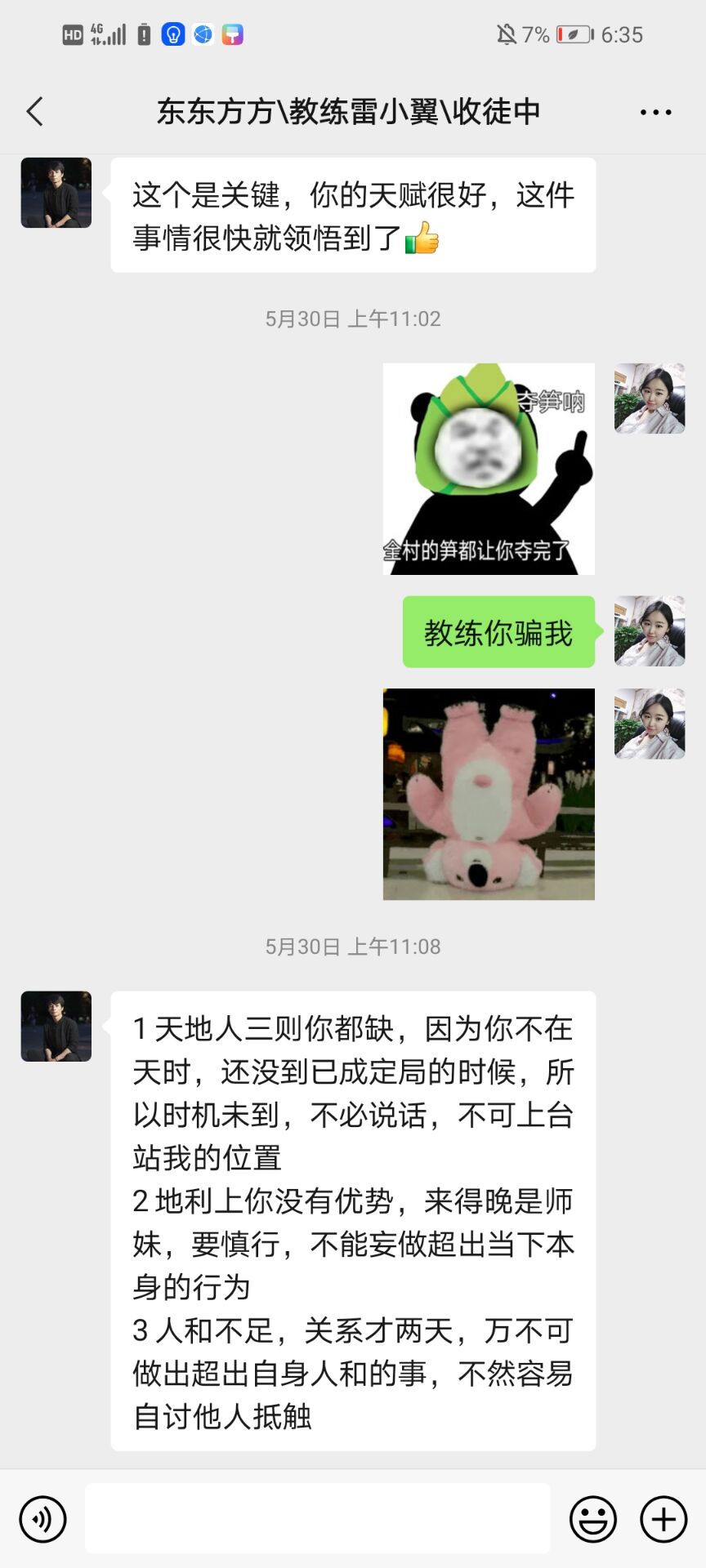 2. 我和大师兄,前两天因为第一次开班,内心比较 恐惧,处处戒备,于是在我心里有了一条“自家人慎入”的信念。于是大师兄一进群就把大师兄架在火上烤,收了大师兄9.9¥。且不说教练都不这么做,再者,我们师兄妹缘法已定。你是师兄我是师妹,师妹不可教导师兄,就像儿子不能管教爸妈。而我就是这么做了。而这,也是我之前一贯作风。