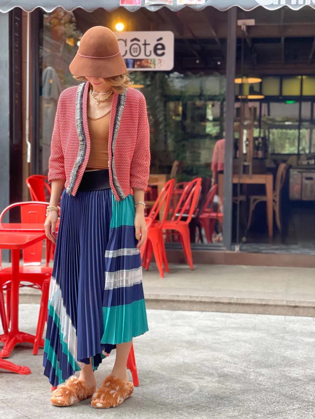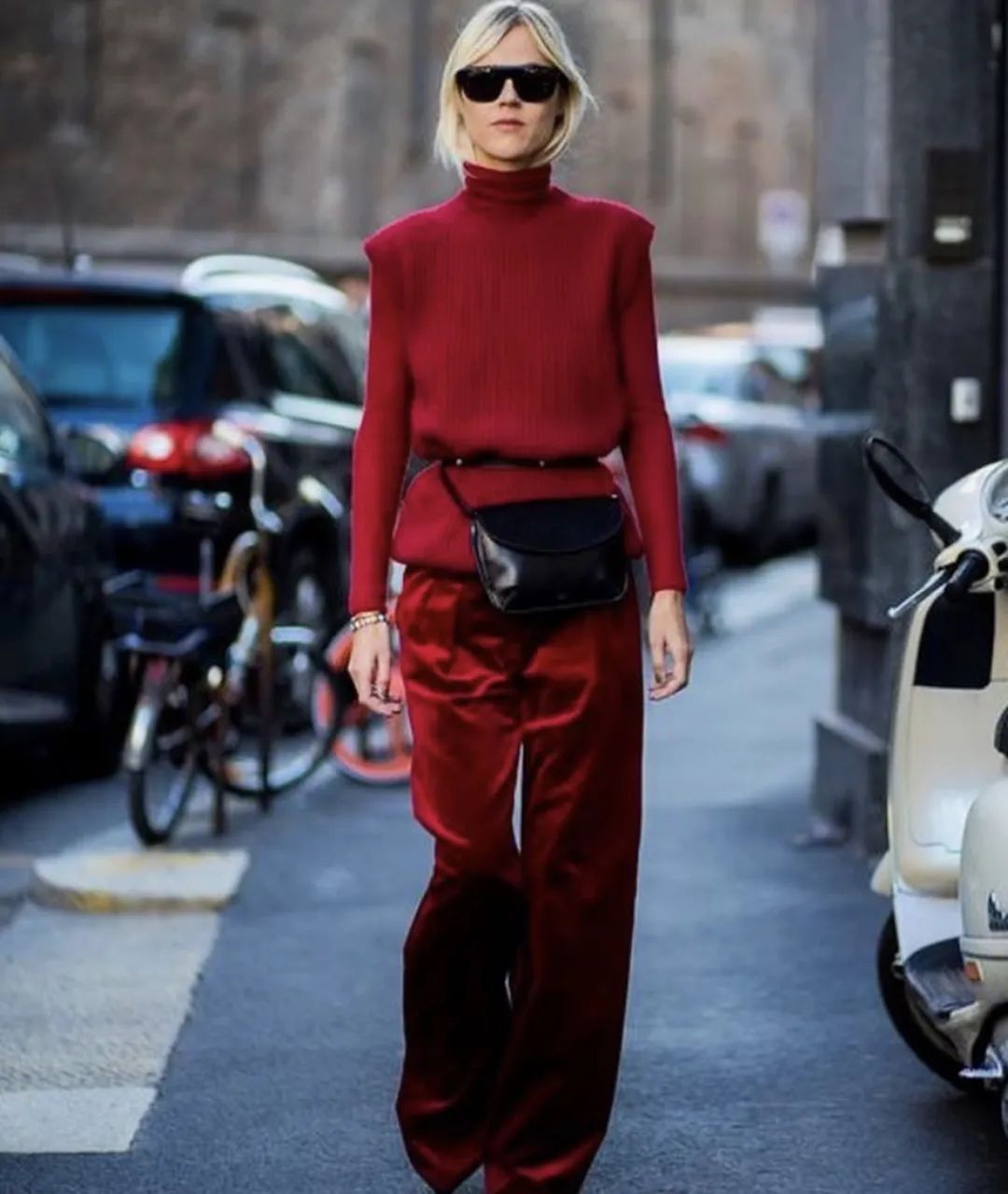 如果担心hold不住大面积红色的仙女们,也可以选择小面积的颜色露出,比如帽子、手袋、皮带等装饰。