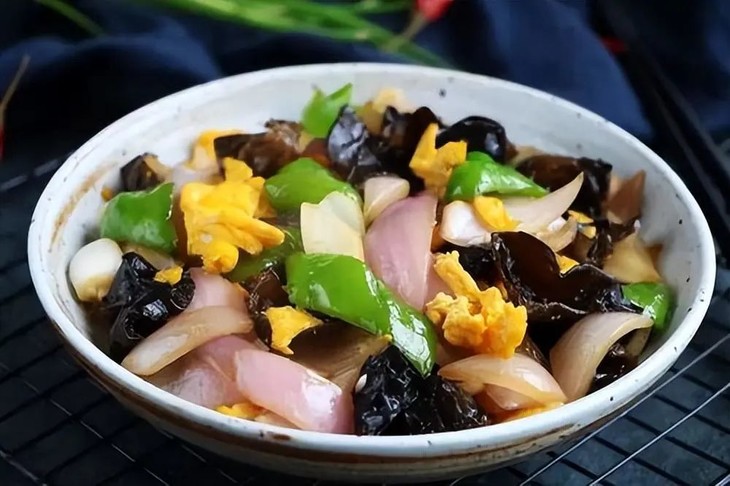 接着,锅留底油,把洋葱下锅,大火翻炒30秒,然后把煎好的鸡蛋和木耳下锅,放上点生抽,盐,鸡精,味精调味,接着大火翻炒30秒,就可以出锅装盘吃了,口感清脆,降肝火助眠,快点做起来吧。