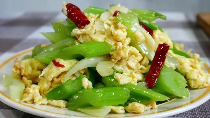 接着把锅烧热再放油,把鸡蛋三个下锅,炒熟后盛出来备用,接着锅留底油,葱姜蒜下锅炒香之后,把芹菜下锅,再把鸡蛋下锅,大火翻炒两下,放上点生抽,精盐,鸡精,味精,再次大火翻炒30秒,炒出香味后,就可以出锅装盘吃了,降火助眠又美味。