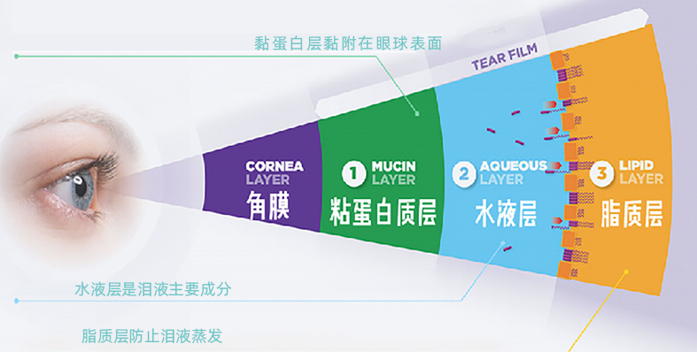 泪膜由黏蛋白层、水液层、脂质层三层结构构成。其中,黏蛋白层讲泪膜附着在眼表,水液层为眼睛提供水分和营养,脂质层保护水液层,减缓蒸发。