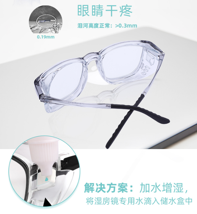 泪膜的稳定性被破坏后,就会导致泪液分泌不足,或泪液的蒸发速度过快。从而造成了我们的眼睛出现了以上几种不同情况的不适症状。这时,我们就需要借助外力来减少泪液的蒸发,保证眼睛的湿润度,于是我们需要用到湿房镜。