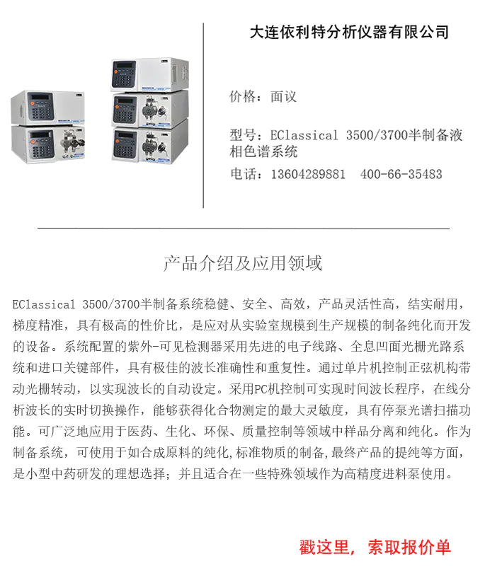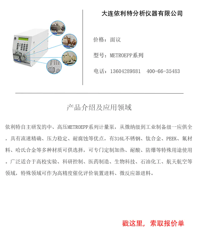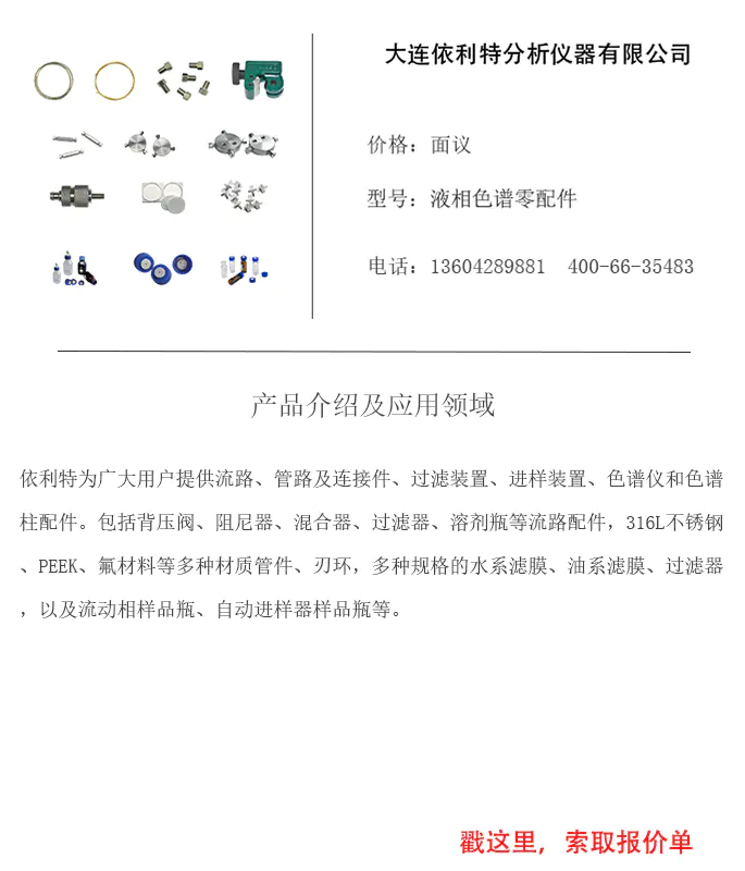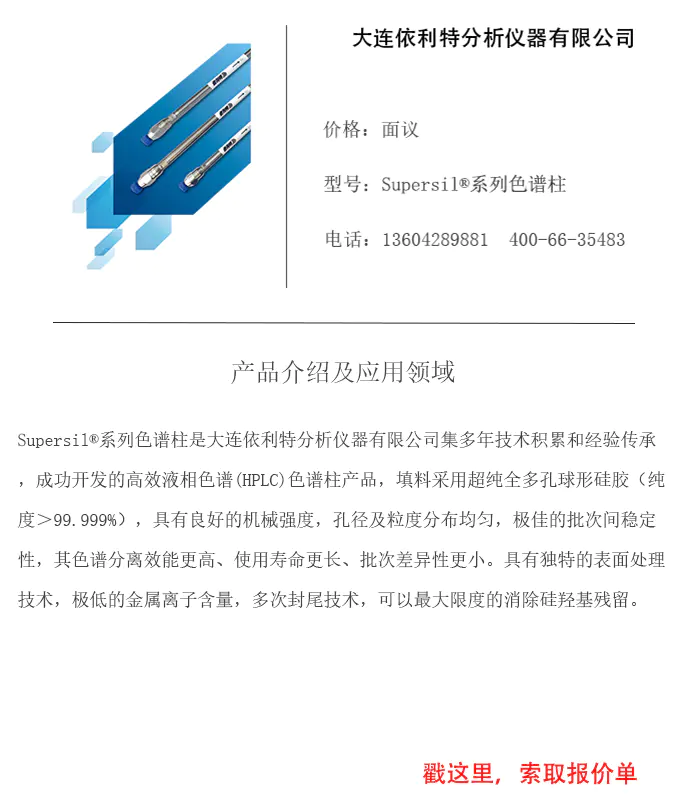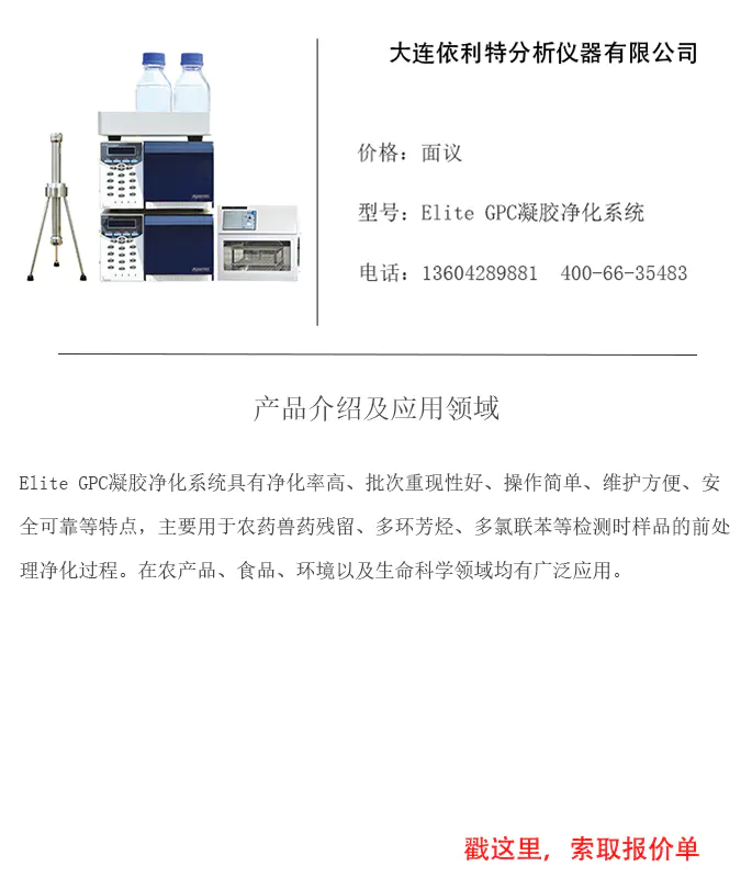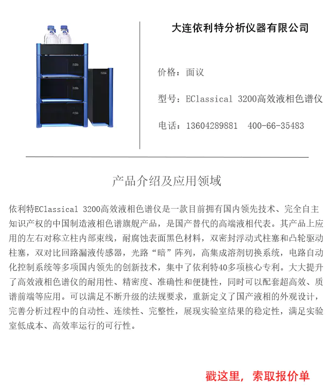 大连依利特分析仪器有限公司和依利特(苏州)分析仪器有限公司(统称依利特仪器公司)以科技创新为动力,以质量稳定为根本,以服务诚信为原则,专注于液相色谱仪研发,是高效液相色谱仪、色谱工作站、色谱柱等液相色谱行业国家标准的主持起草单位。现有系列产品包括从分析到制备以及工业生产用色谱高压输液泵、多种不同类型检测器、进样器、色谱工作站(包括GPC凝胶色谱数据处理)、计量泵、各种规格型号的色谱柱以及紫外分光光度计等,实现了液相色谱仪的系列化,产销遍布全国,并远销欧美、非洲、拉丁美洲、东南亚、中东及中亚等地区。