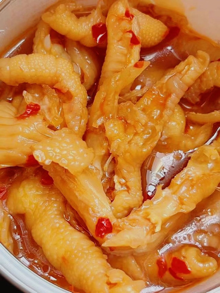 🐥满满的胶原蛋白,咬一口口感Q弹十足 每一根鸡爪都包裹着清爽酸辣的酱汁胶质十足满满的胶原蛋白口感Q弹十足咬上一口皮滑有嚼劲! 细嫩富有弹性酱汁的味道已完全浸入让人回味无穷!去骨连筋只要吃上一口根本就停不下来了~
