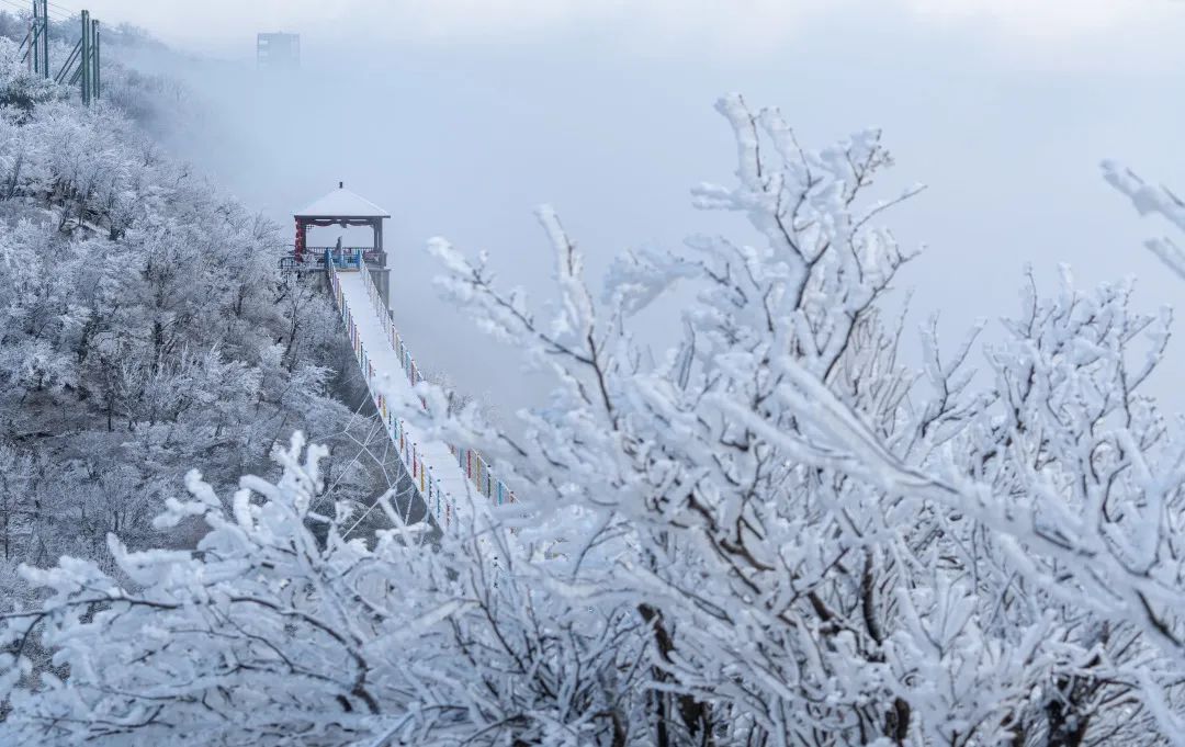 全长131.4米,晃晃悠悠徜徉云海,山下雾气凝聚升至山顶,栈桥上犹如腾云驾雾、置身仙境。