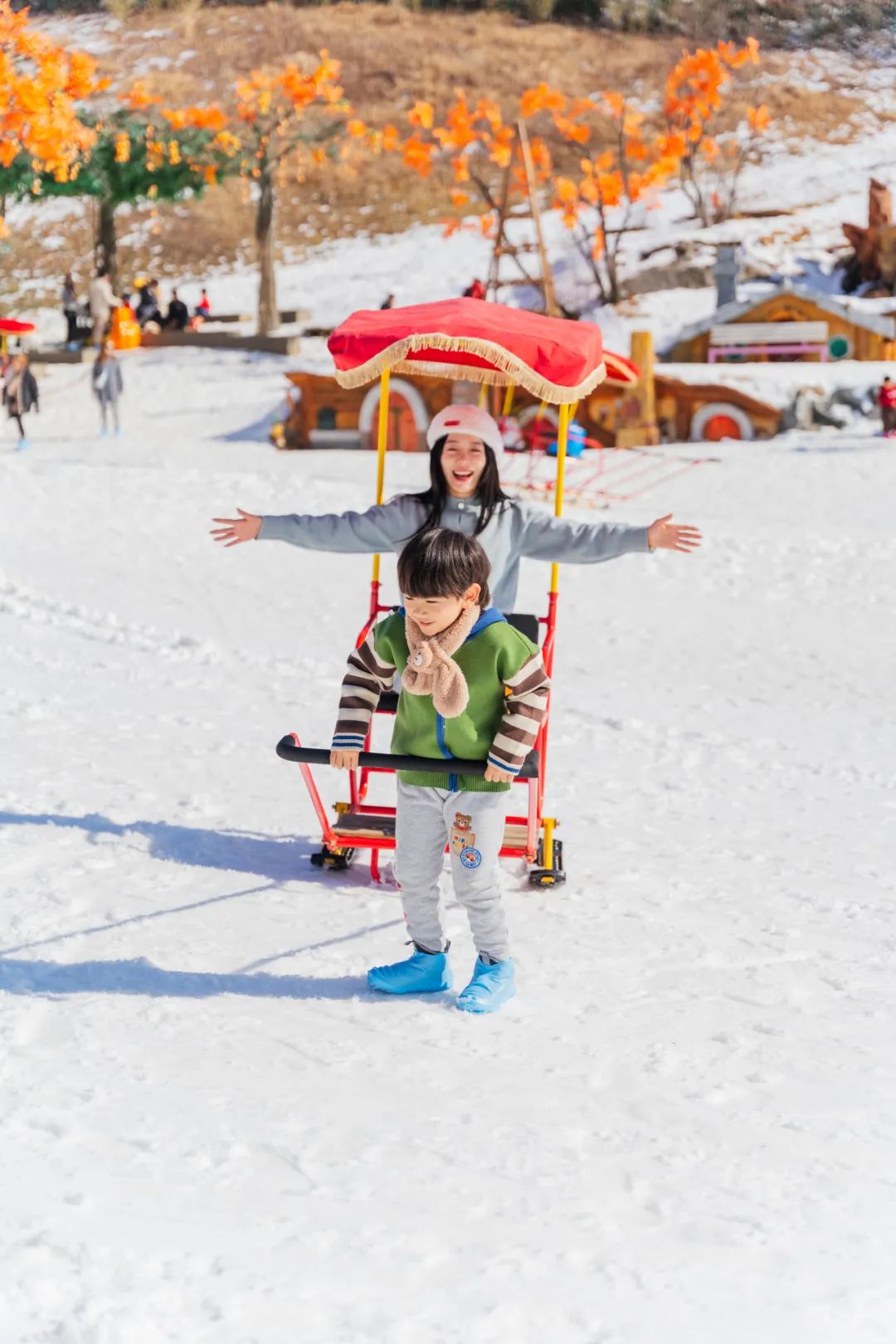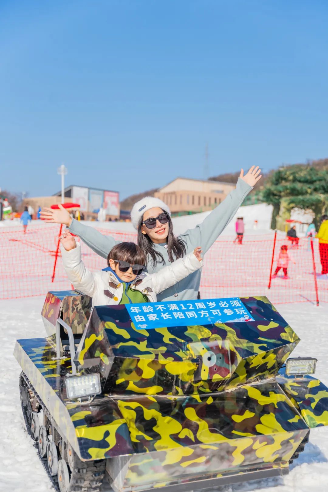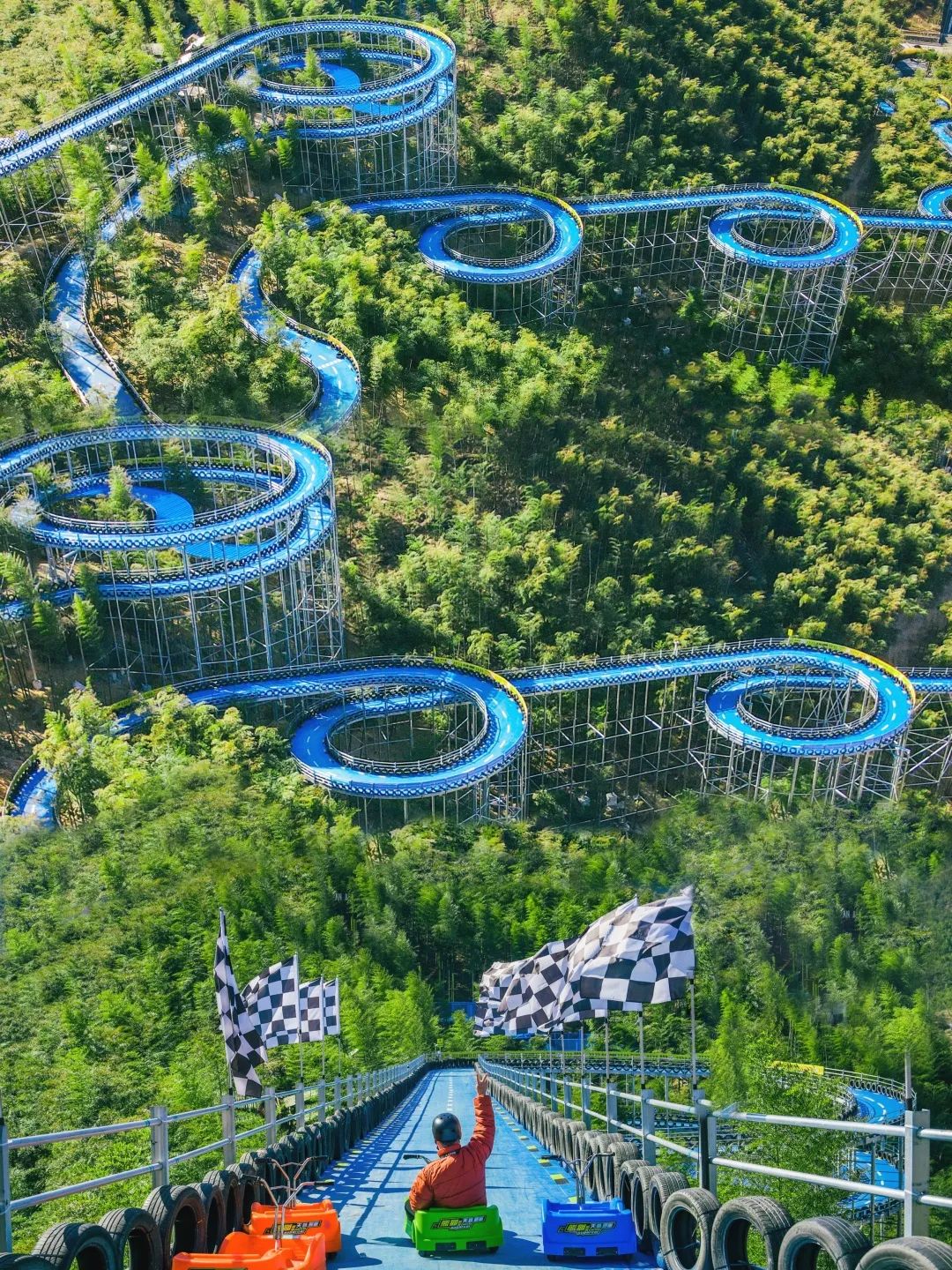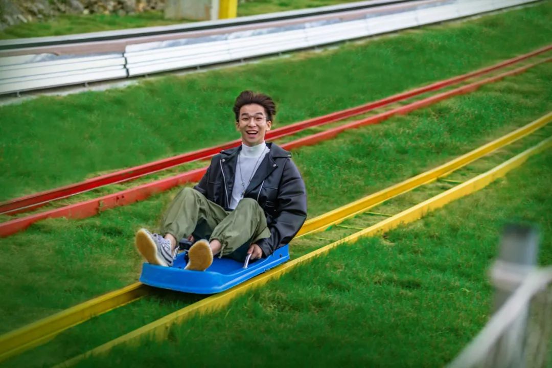 滑草又添新玩法,坐上有轨道的小车车,放开手跟我们招个手say hi吧!