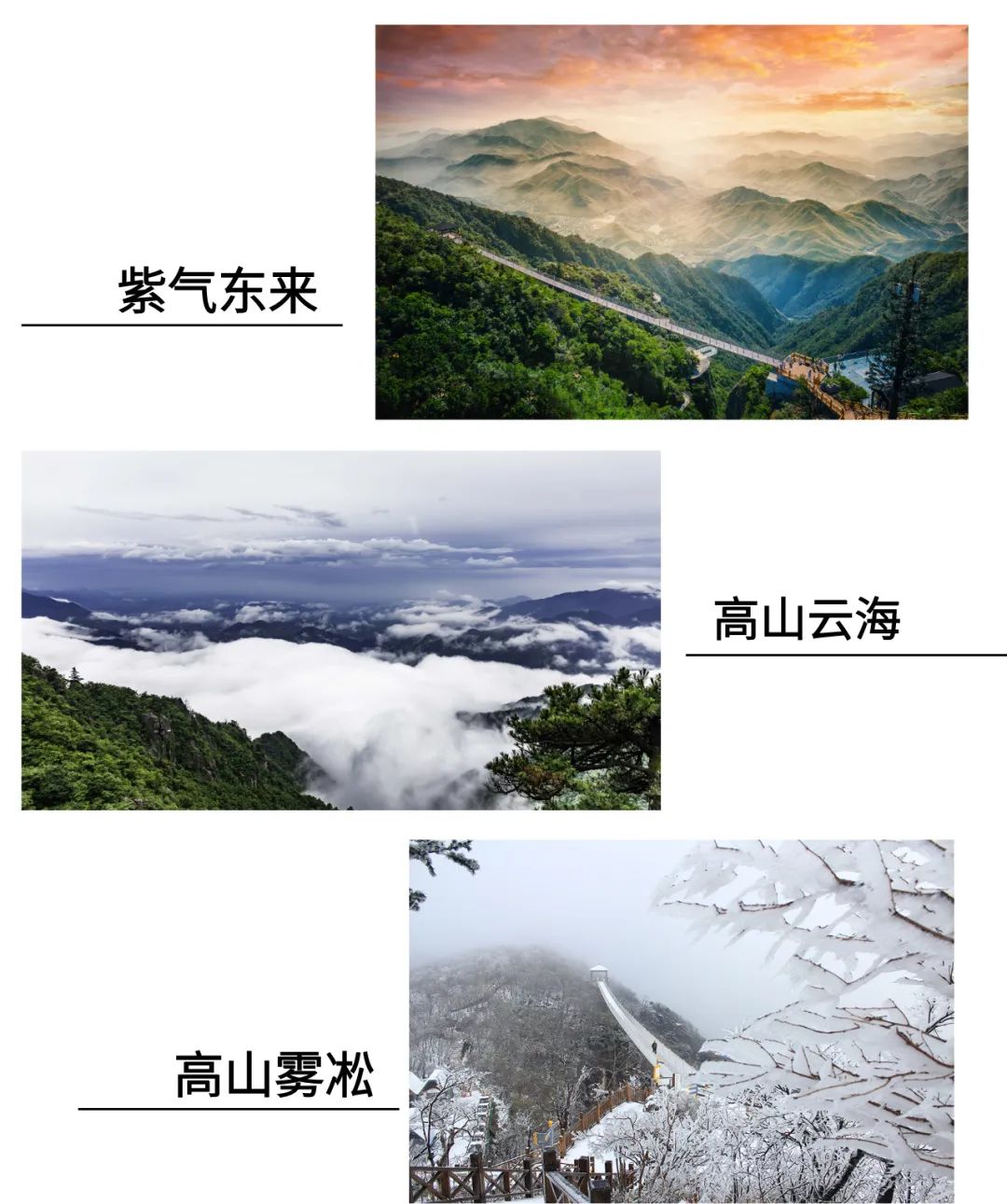悬崖心跳乐园:魔鬼秋千,天空之阶,悬崖秋千,水晶廊桥,空中自行车,凌空飞步,飞拉达·悬崖穿越,悬崖蹦极,步步惊心,云中漫道,玻璃栈道,风之谷,云海栈桥,鸟巢,老鹰窠观景台,石蜡烛,好望角,旋转自行车,双人秋千,空中之音;