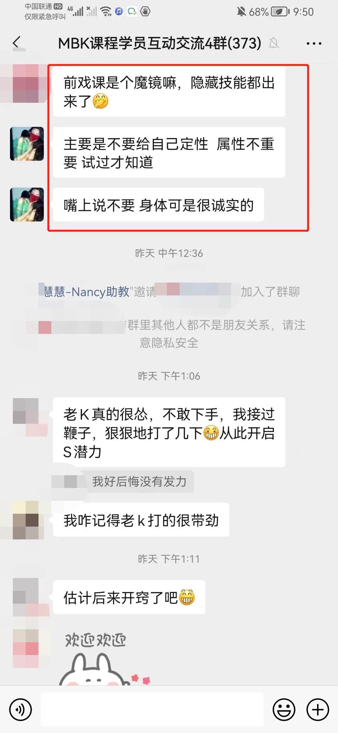 于是我着重四处寻找可以专门是性的课。又很怕渠道或者课程歪的、色情的、观念是不对的。已经忘记是通过什么途径了解到这个课程的,反正我是在群里观察了很久,看到老师们的发言三观很正才决定付费的