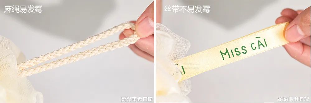 考虑到大家的沐浴球都是放在浴室,我们把不易晒干的绳子,换成了速干的丝带挂绳。