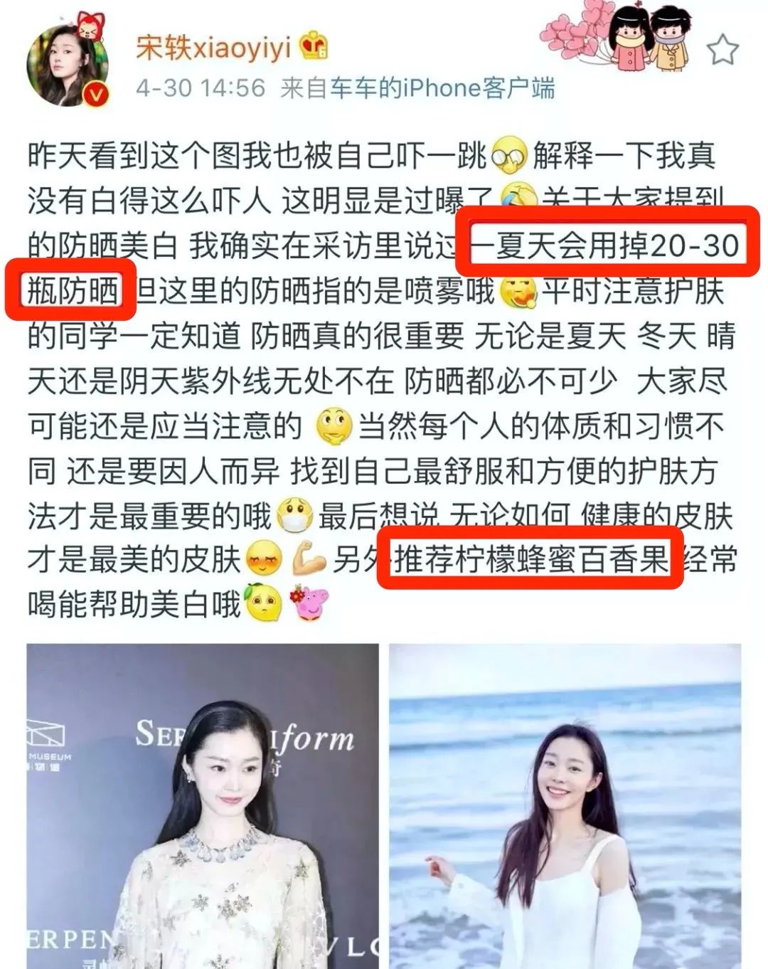 每次出现总是白到发光的宋轶秘诀其实很简单,除了一个夏天疯狂用掉20-30瓶防晒,还会每天坚持喝蜂蜜柠檬百香果。