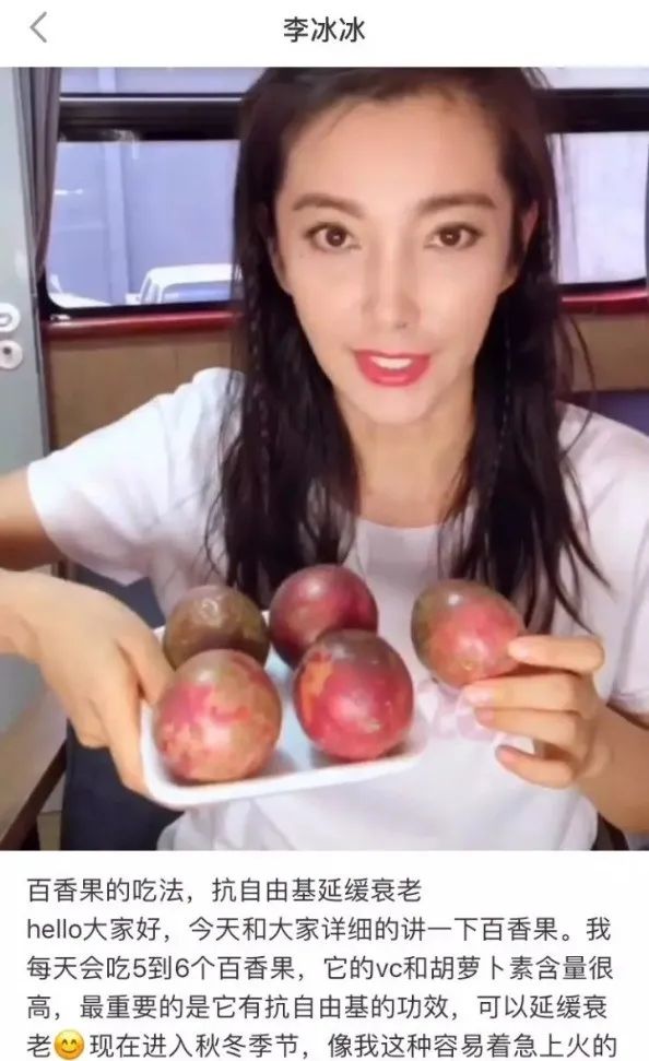 李冰冰,还专门为百香果录了个视频,说自己每天都要吃 5、6 个百香果延缓衰老。