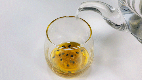 冲泡起来舀两勺放到杯子里,加入适量温水或凉水,轻轻搅拌几下,一杯酸甜清爽的柠檬百香果茶就好了。