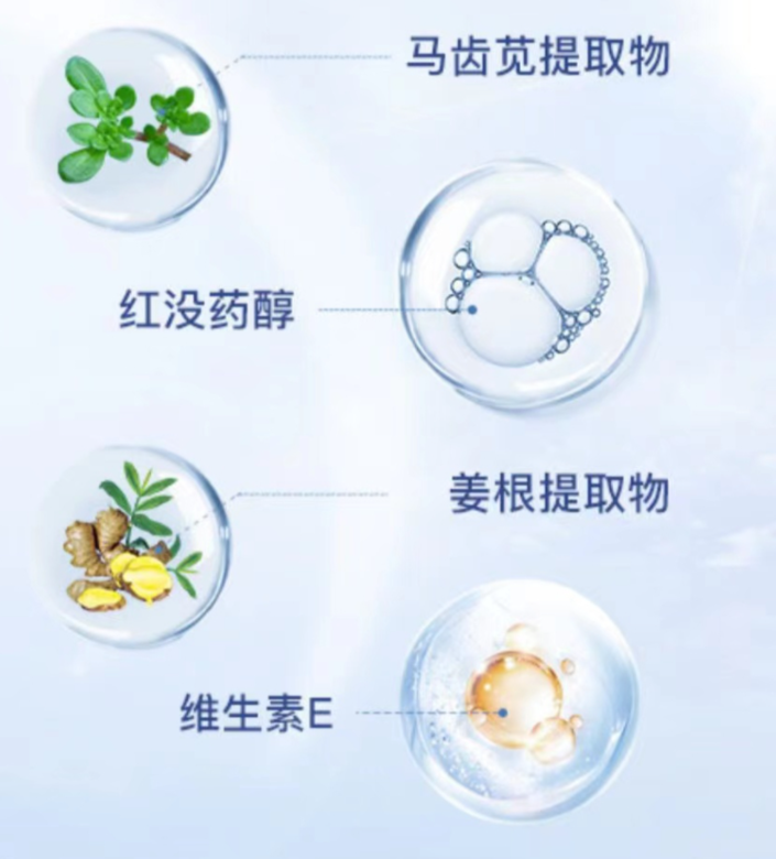 舒缓特护安肤的功效就是由三款植物成分,马齿苋提取物、红没药醇、姜根提取物,来达成的,这仨,单个抓出来可都是舒缓修护的尖子生,其中红没药醇还是个广泛运用在防晒产品当中提升产品防护力,平衡防晒霜产品舒缓功效的大咖!