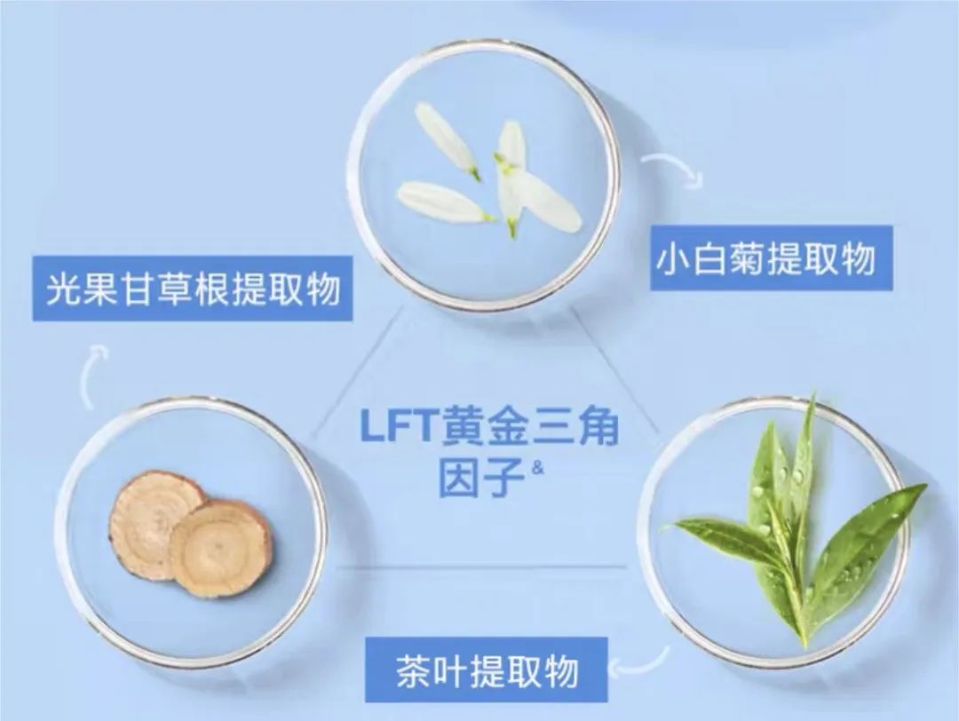 上文我提到了,油皮还需要关注舒缓和抗氧化的诉求,最后,P&G在这凝乳里运用了抗氧化的组合,茶叶提取物+小白菊提取物+光果甘草根提取物;