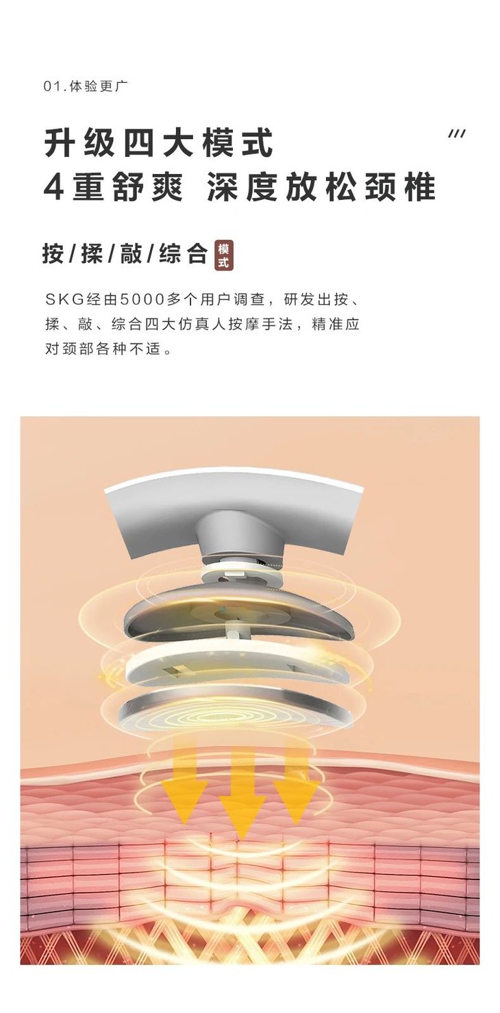 SKG经由5000多个用户调查,研发出模拟中医的按摩手法,给肌肉带来可以仿真人按、揉、敲、综合的四大按摩手法,zui终达到疏通经络,缓解颈部各种不适的效果。