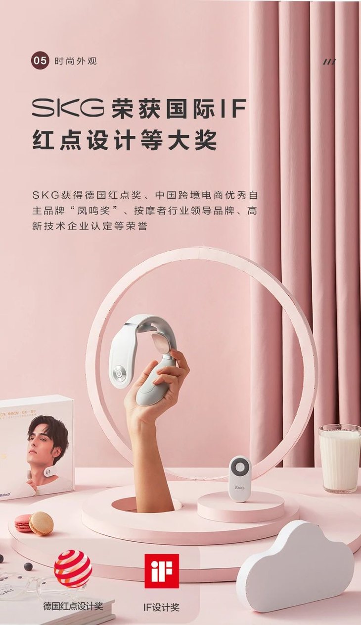 SKG的研究院更是囊括了国际知名的皮肤科医生、医美专家、医疗器械和电磁波技术专家、微波射频专业博士等尖端人才。研发的产品多次荣获德国红点奖、IF设计大奖等国际奖项,拥有177项全球核心专利。SKG颈椎按摩器的出现,给你完全不一样的按摩体验!说给自己请了一个全年无休,24小时随叫随到的老中医也不为过!追剧、玩手机后按一按,什么肌肉疲劳、腰肌劳损全被按没了,一天的疲惫消失得无影无踪。