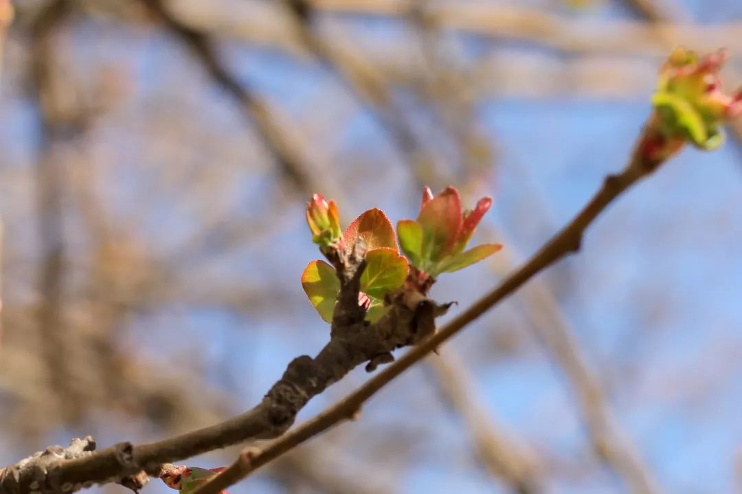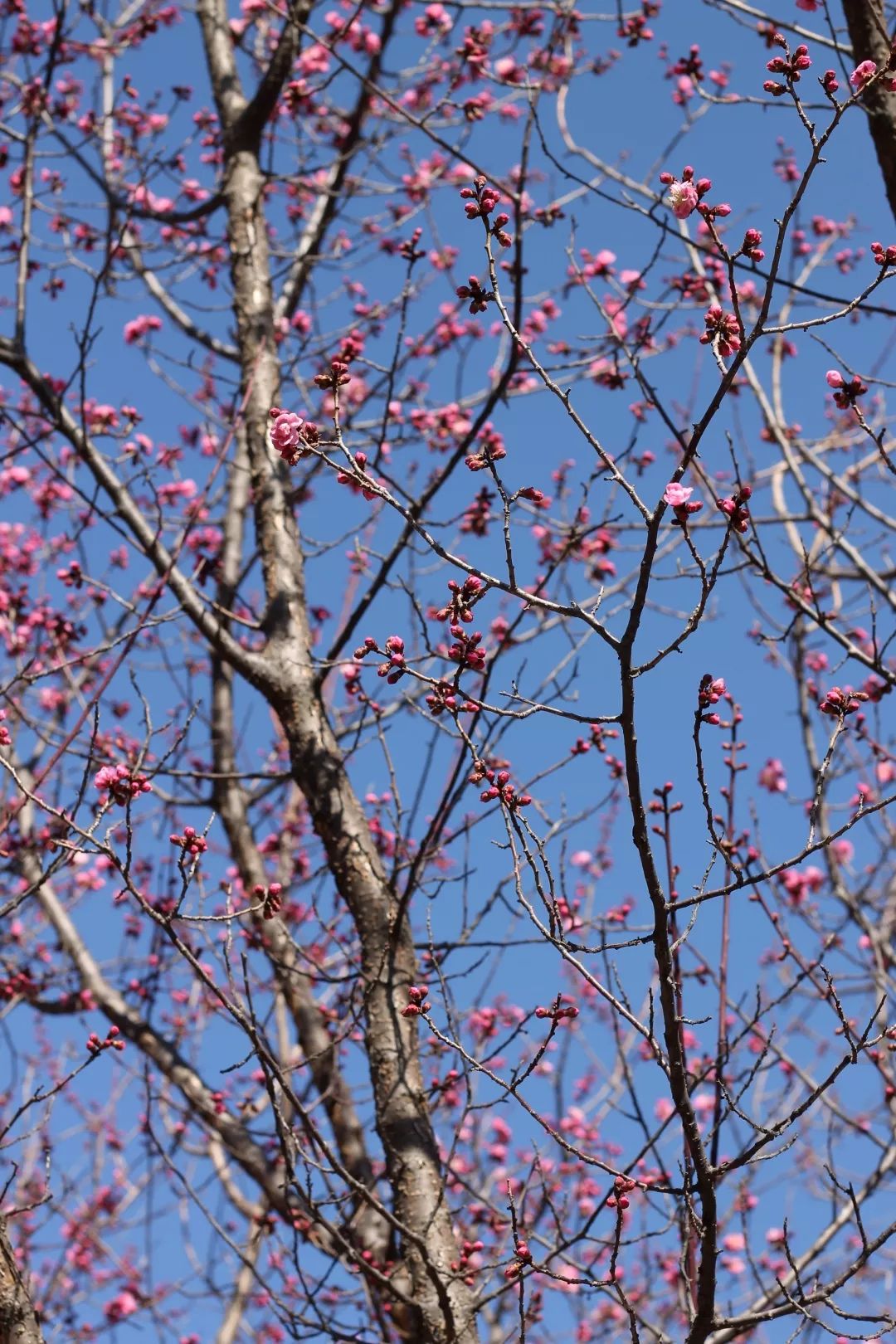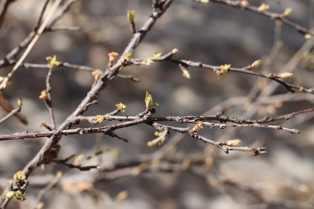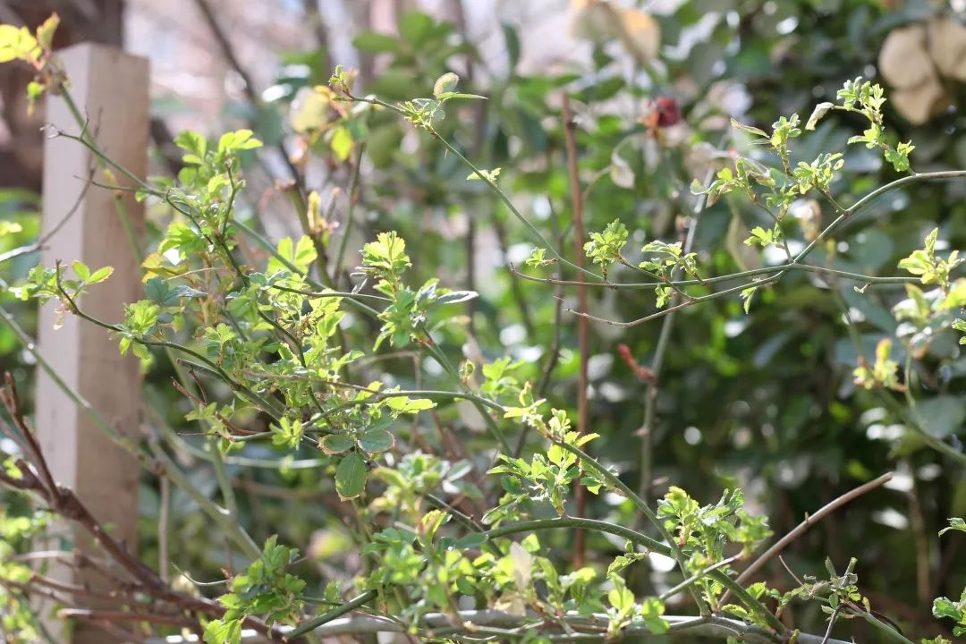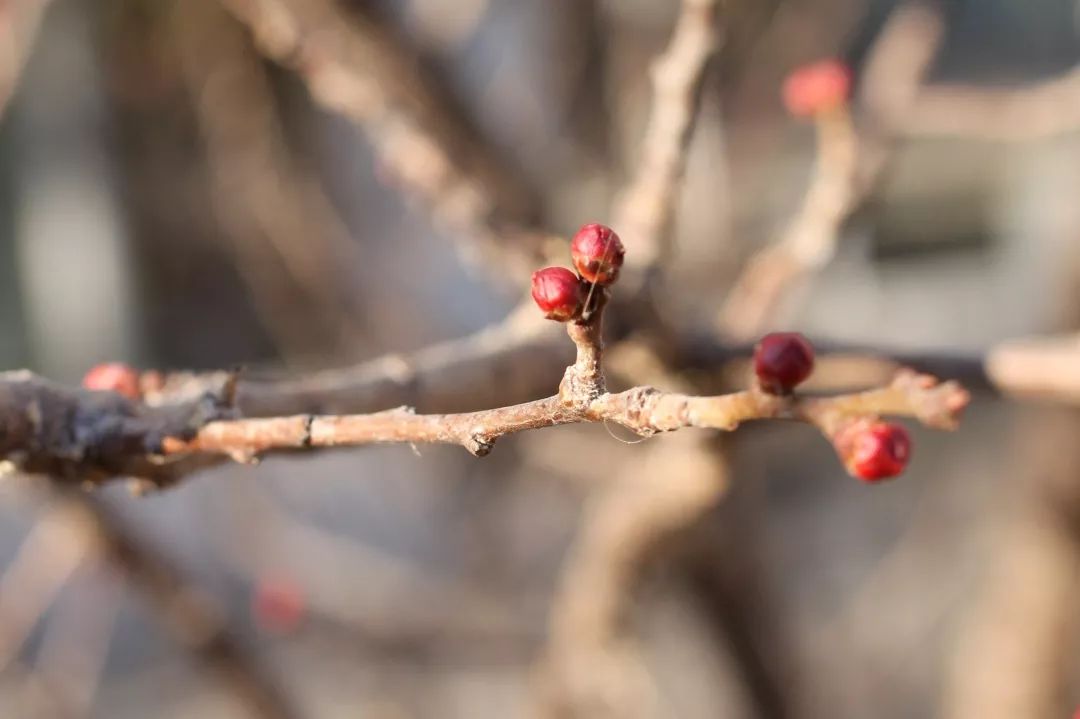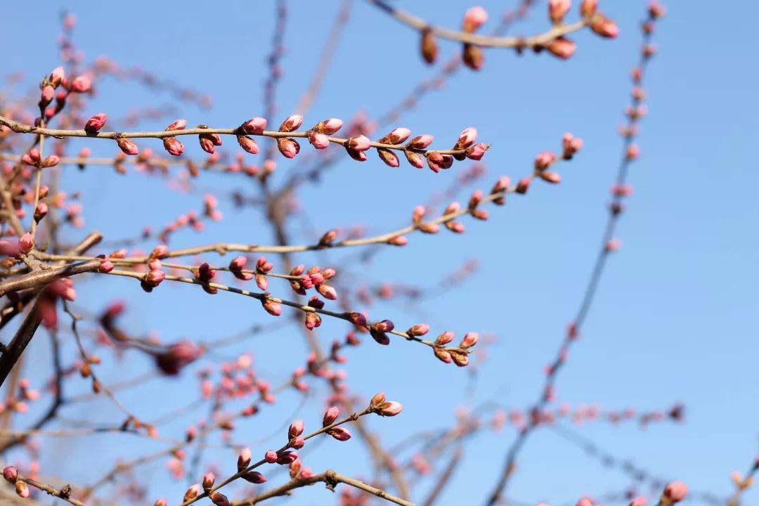 回到现实里,霾天过去,风来了,或者这两句话反过来也成立。才进入3月,气温就开始持续扶摇直上, 太阳朝向北回归线移动着,能很直观地感受到光和能的威力在渐强。南风把春天过早地送回来,小区里,山桃粉粉的花瓣已经从紫红的萼片中冲出来,对生的花芽印在蓝天上,杏要稍稍慢一点,但老枝上的花蕾显得那么有生命力,毛樱桃和西府海棠的花芽眼见着也是蓄势待发的样子,蔷薇的新叶绿意柔美,我还是有些不能相信,院子里的这一条蔷薇花径,在一个多月之后面貌将会迥然不同。